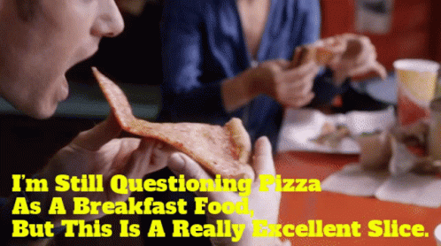 Amelia Shepherd from Grey's Anatomy enjoys a slice of pizza, questioning it as breakfast but finding it excellent.
