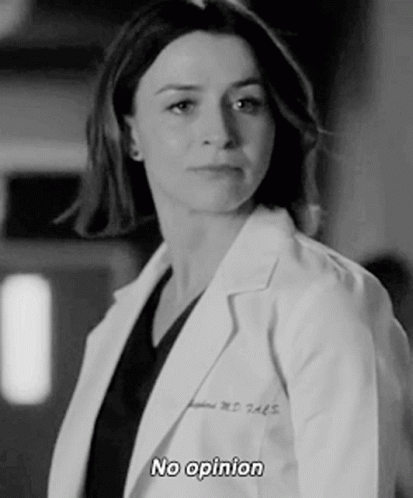 Amelia Shepherd from Grey's Anatomy states 'No opinion' in a black and white scene.