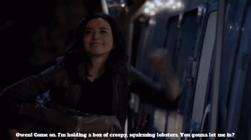 Amelia Shepherd (Caterina Scorsone) pleads with Owen to let her in, holding a box of 'creepy, squirming lobsters'.