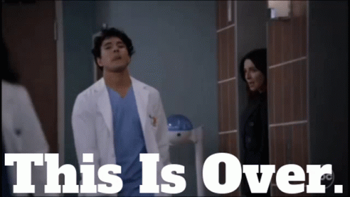 A dramatic moment from Grey's Anatomy with a man in a lab coat and the prominent text 'This Is Over.' Related to Amelia Shepherd's storyline.