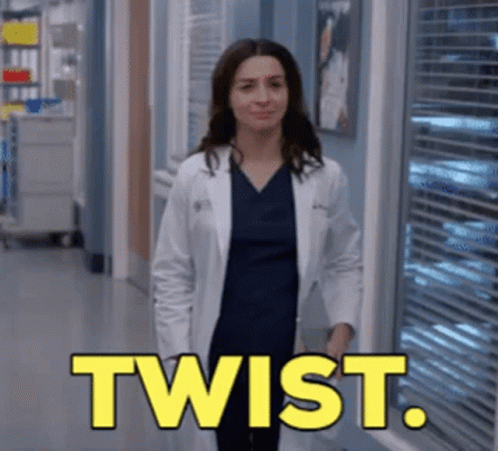 Amelia Shepherd, a doctor in a lab coat, stands in a hospital hallway with the word "TWIST." appearing on screen.