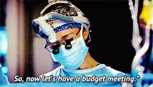 Amelia Shepherd from Grey's Anatomy, wearing surgical gear, delivers the iconic line: 'So, now let's have a budget meeting.'