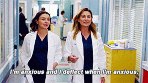 Amelia Shepherd (Caterina Scorsone) from Grey's Anatomy admits, 'I'm anxious and I deflect when I'm anxious,' walking through the hospital.