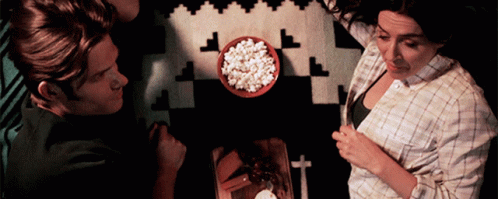 a man and a woman are sitting at a table with a bowl of popcorn on it