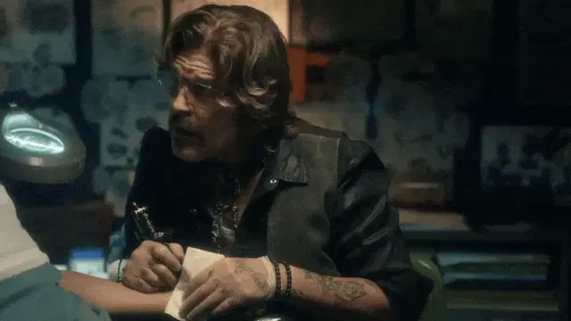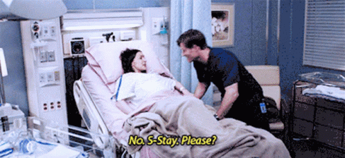 Amelia Shepherd in a hospital bed, holding hands with Atticus Lincoln and asking him to stay.