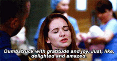 April Kepner from Grey's Anatomy expresses being dumbstruck with gratitude and joy, delighted and amazed.