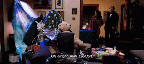 Atticus Lincoln (Chris Carmack) from Grey's Anatomy reacts to a 'cool fort' in a living room.
