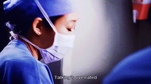 Cristina Yang from Grey's Anatomy, played by Sandra Oh, says "Talking's overrated" while emotional.