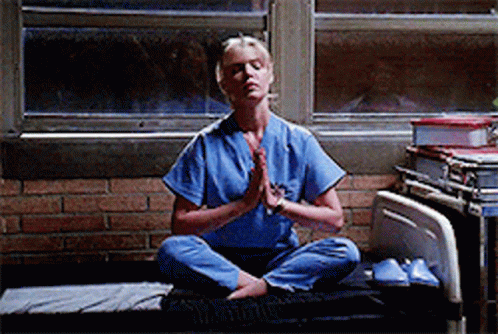 Izzie Stevens (Katherine Heigl) from Greys Anatomy meditates in a hospital room, performing yoga stretches.