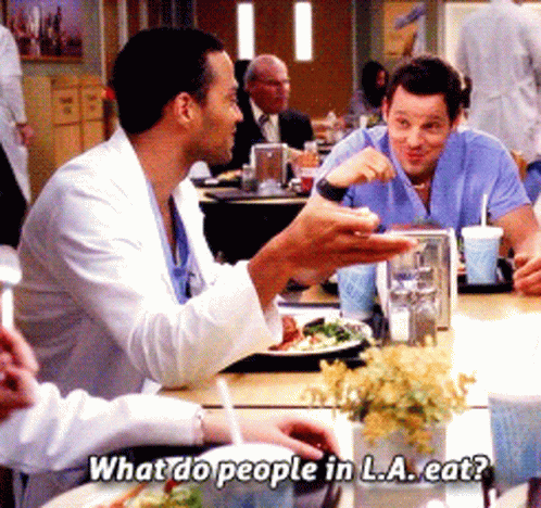 Jackson Avery (Jesse Williams) asks Alex Karev (Justin Chambers) about food in Los Angeles during a cafeteria scene in Grey's Anatomy.