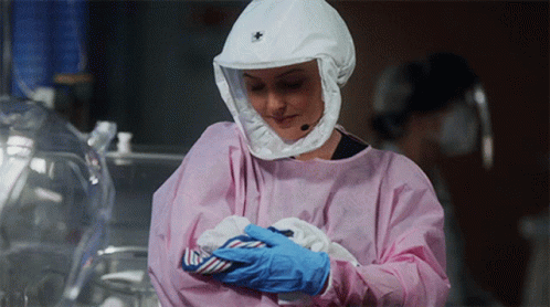 Jo Wilson, played by Camilla Luddington, holds a baby in a pink gown and protective gear on Grey's Anatomy.