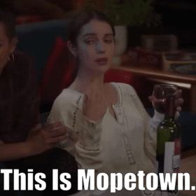 a woman is sitting at a table holding a glass of wine and a bottle of wine with the caption this is mopetown