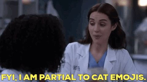 a woman in a lab coat talks to another woman and says " fyi i am partial to cat emojis "