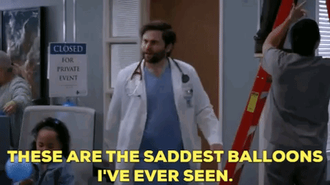 Levi Schmitt from Greys Anatomy looks at sad balloons, remarking 'These are the saddest balloons I've ever seen'.