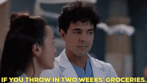 Lucas Adams from Grey's Anatomy delivers a line about throwing in two weeks' groceries.