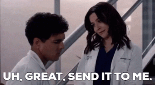 Lucas Adams (Niko Terho) from Grey's Anatomy says 'Uh, great, send it to me' to a colleague.