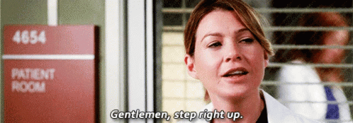 Meredith Grey (Ellen Pompeo) from Grey's Anatomy says 'Gentlemen, step right up' with a confident expression.