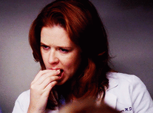 April Kepner from Grey's Anatomy eating a snack with a thoughtful expression while wearing her lab coat.