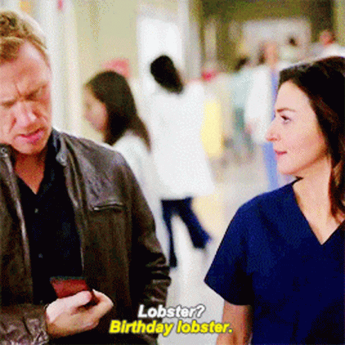 Owen Hunt offers Amelia Shepherd a birthday lobster in a scene from Grey's Anatomy.