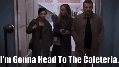 a man and two women are walking down a hallway and the caption says i 'm gonna head to the cafeteria