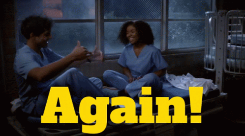 Simone Griffith (Alexis Floyd) and a male character from Grey's Anatomy sit on a bed, with the word "Again!" displayed.