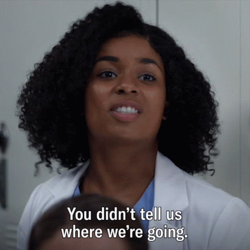 Alexis Floyd as Simone Griffith in Grey's Anatomy, wearing a white coat and saying, 'You didn't tell us where we're going.'