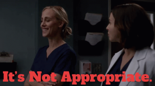 Teddy Altman, played by Kim Raver, in a scene from Grey's Anatomy with the text 'It's Not Appropriate.'