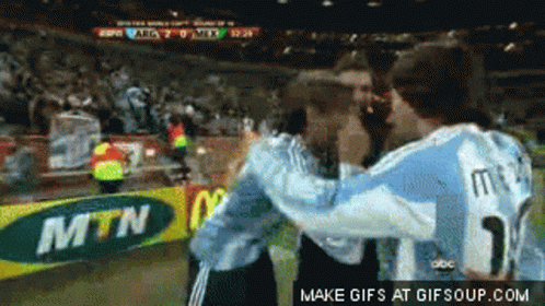 Gabriel Heinze and a teammate celebrate a goal for Argentina, leading Mexico 2-0.