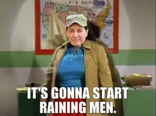 Griselda Gears meme featuring a woman's face superimposed, singing 'It's gonna start raining men'.