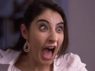 Erika Russo with a wide-open mouth and eyes, expressing extreme surprise or shock.
