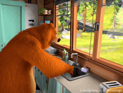 Grizzy the bear struggles to get water from a broken tap in his cabin on a hot day, leading to frustration.