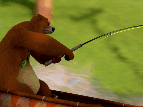 Grizzy the bear from Grizzy and the Lemmings is seen intently fishing from a wooden boat.