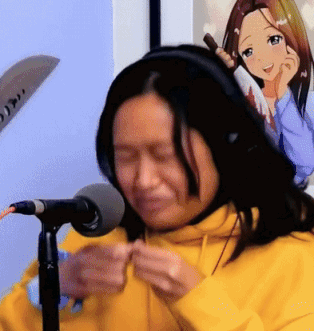 a woman wearing headphones is sitting in front of a microphone with a picture of a girl on the wall behind her
