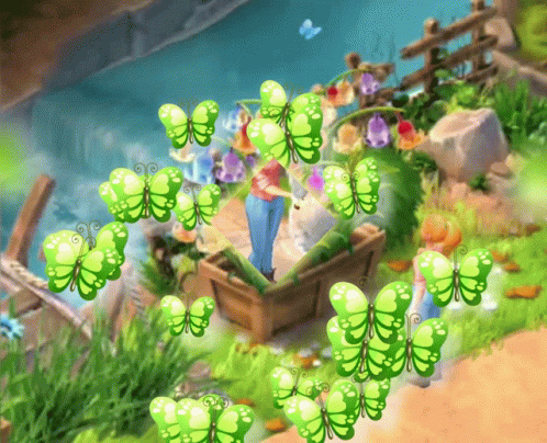 An animated girl tends to a planter of colorful flowers as green butterflies flutter around a vibrant garden scene.