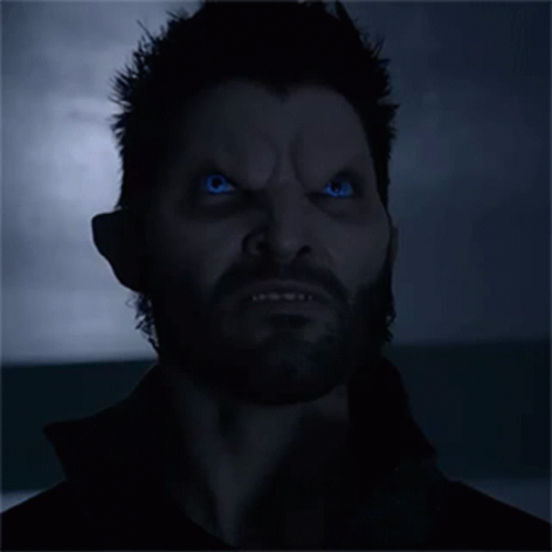Derek Hale growls intensely, baring fangs with glowing blue eyes, ready for a fight in Teen Wolf.