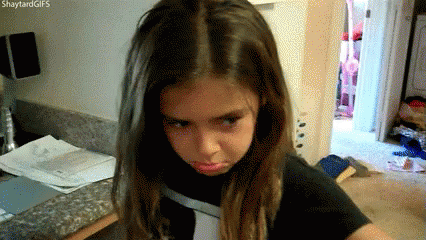 A grumpy kid with long hair pouts and makes a funny face in a kitchen setting.