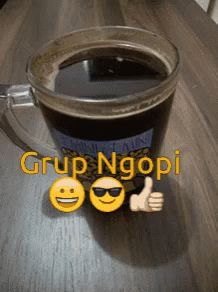 A cup of black coffee with 'Grup Ngopi' text and emojis, perfect for a morning coffee group.
