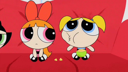 Blossom from The Powerpuff Girls unexpectedly vomits on Bubbles while they are sitting on a red couch eating popcorn.