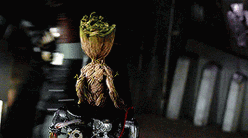 Baby Groot from Guardians of the Galaxy waves hello, showcasing his adorable and friendly nature.
