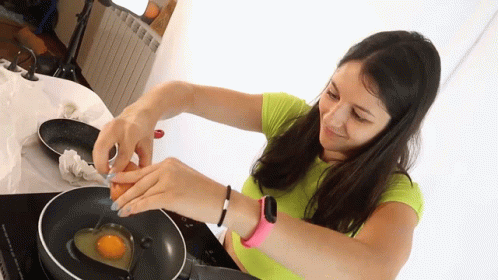 Natalia cracks an egg into a heart-shaped frying pan, creating a delightful breakfast with an amazed expression.