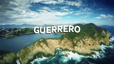 An aerial view showcasing the beautiful coastline of Guerrero, Mexico, with the word 'GUERRERO' overlaid.