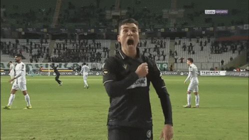 Guilherme Sitya of Konyaspor passionately celebrates a goal on the football field, pumping his fist.