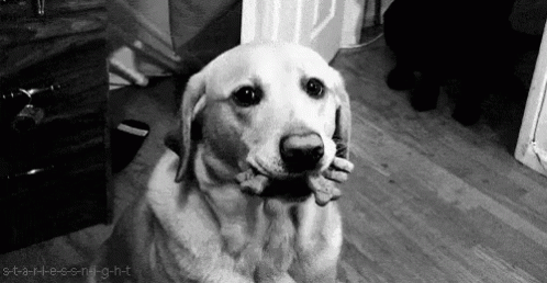 A dog holds a treat in its mouth, looking up with a classic guilty expression.