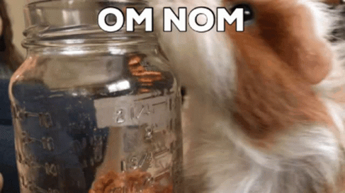 Cute guinea pig hilariously tries to reach a snack inside a glass jar, with 'OM NOM' caption.