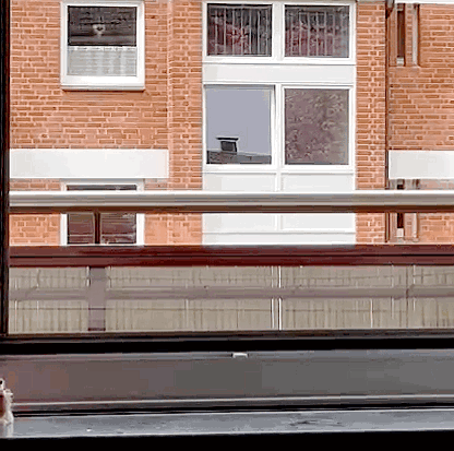 Lucy, a fluffy dog, plays peek-a-boo from behind a balcony railing, barking playfully.