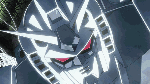 a close up of a robot head with red eyes