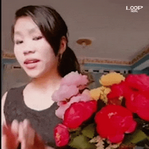 Guransnani holds a bouquet of flowers, making a gesture of apology with the caption 'Please forgive me' in Nepali.