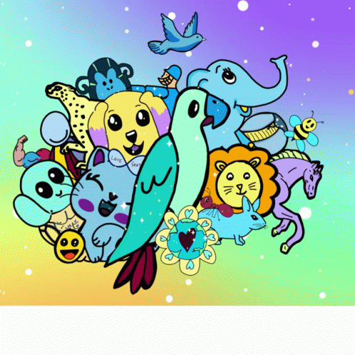 A vibrant animated doodle of various cartoon animals celebrating Happy Guru Purnima, featuring a parrot, dog, and elephant.