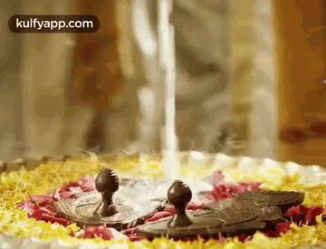 Water poured over sacred padukas and flowers during a Guru Purnima abhishekam ritual, symbolizing devotion.