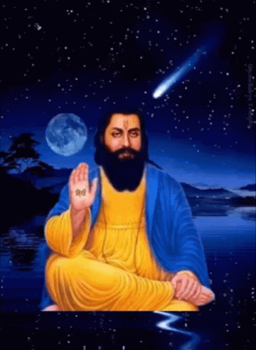 Guru Ravidass depicted in a serene night sky with a full moon and shooting stars, accompanied by a 'Good Morning' message.